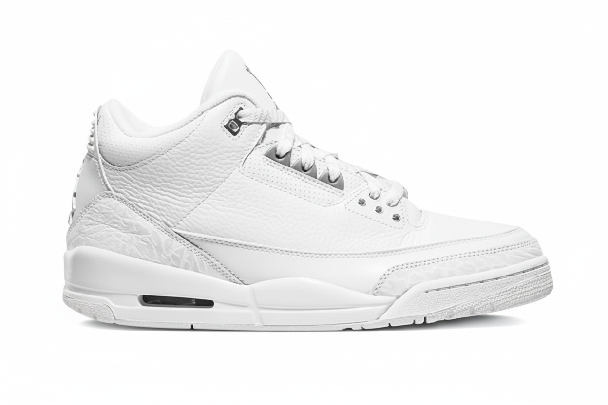 Dinero puro: no hay nada mejor. Esta combinación de colores icónica de los AJ3 regresa para cobrar otro cheque. Impecables y minimalistas, los revestimientos de cuero blanco premium y nobuk con estampado tipo piel de elefante se combinan con detalles color plata metalizado y el bordado "Pure $". ¡Cha-ching!
