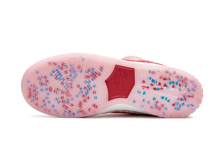 StrangeLove Skateboards ha creado su propio estilo exclusivo combinando una creatividad caótica con lo más divertido del skateboard. La original marca de California colabora ahora con Nike SB para aportar su perspectiva singular a un modelo muy popular: las Dunk Low. Cubierto de terciopelo texturizado con revestimientos de ante, este diseño en tonos pastel está decorado con una combinación de rosas seductores y toques de melón brillante y rojo gimnasio. Las StrangeLove dejan huella, literalmente, con un dibujo de calavera en cada talón. En la suela, los sutiles estampados de corazones representan el amor, justo a tiempo para San Valentín.